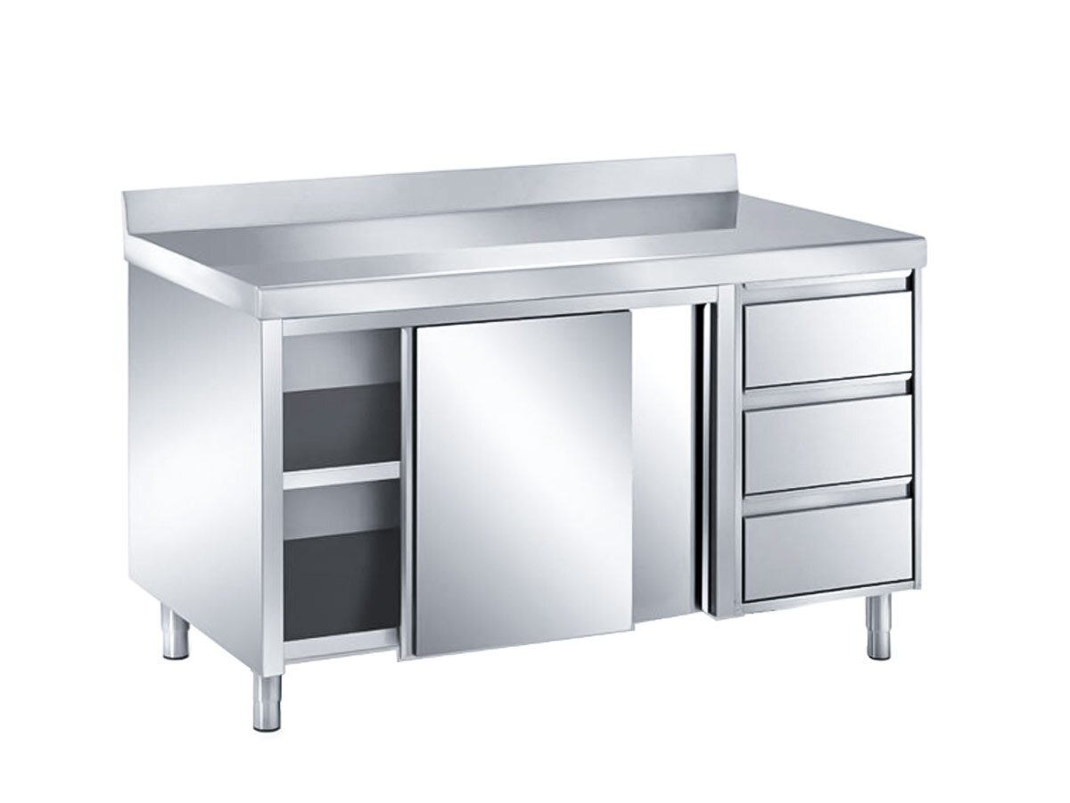 Der PREMIUM Arbeitsschrank aus Edelstahl bietet eine robuste Arbeitsfläche mit Aufkantung und praktischen Schiebetüren. Ideal für professionelle Küchen, die Wert auf Qualität und Funktionalität legen.