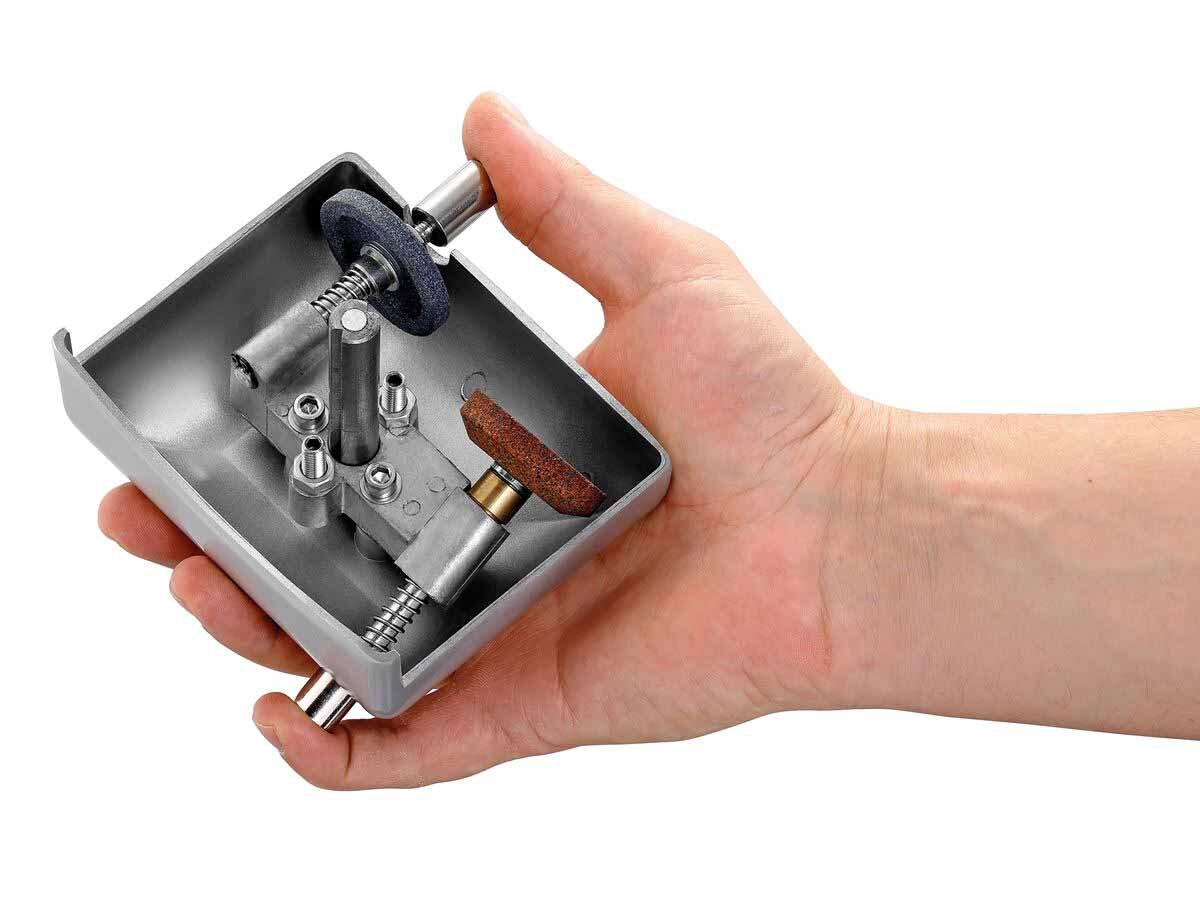 - Integrierter Messerschärfer für dauerhaft präzise Schnitte