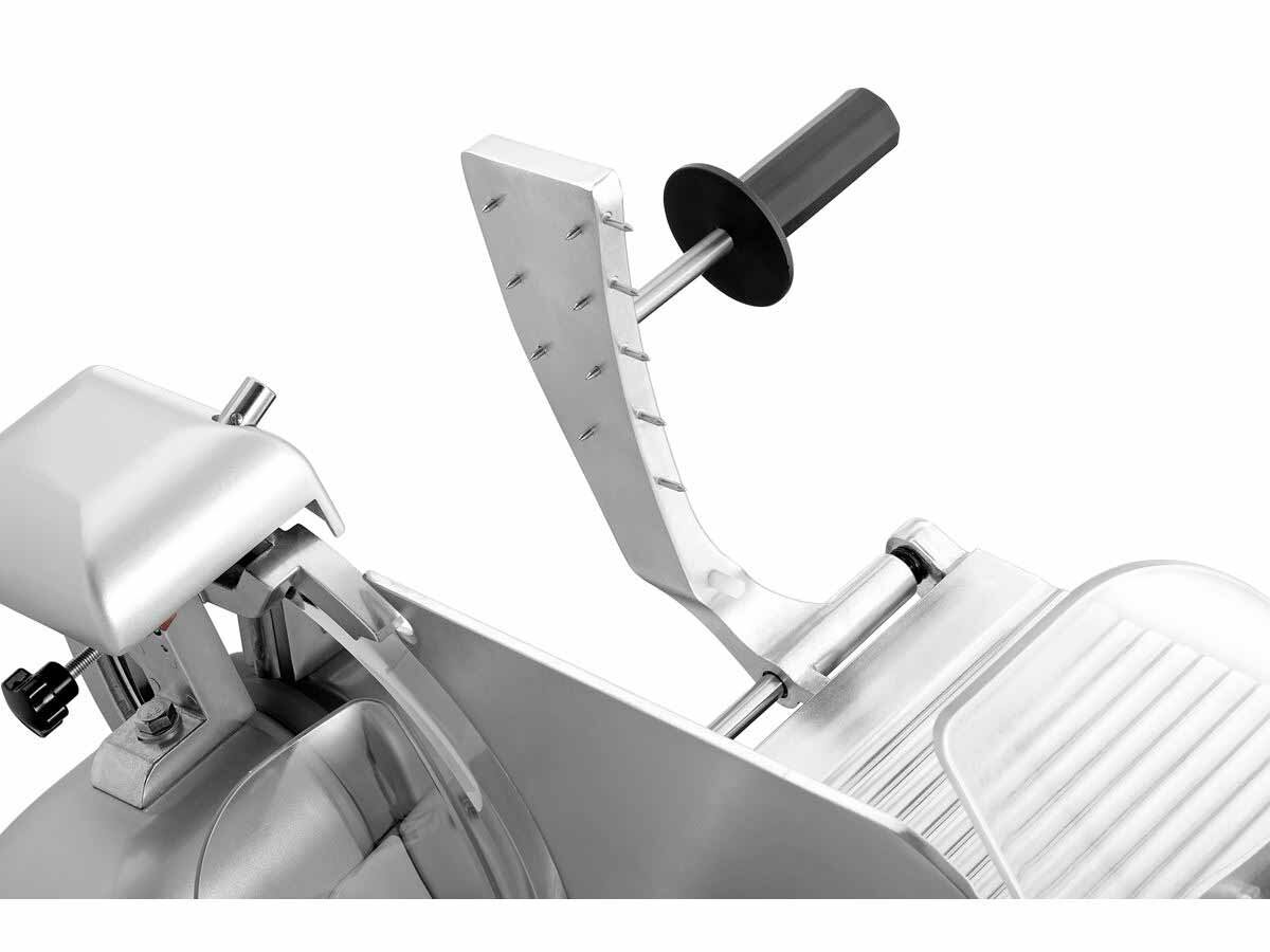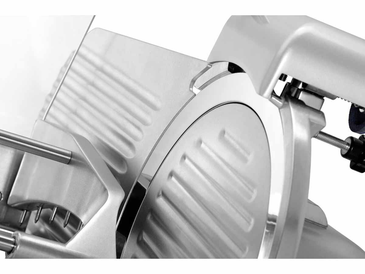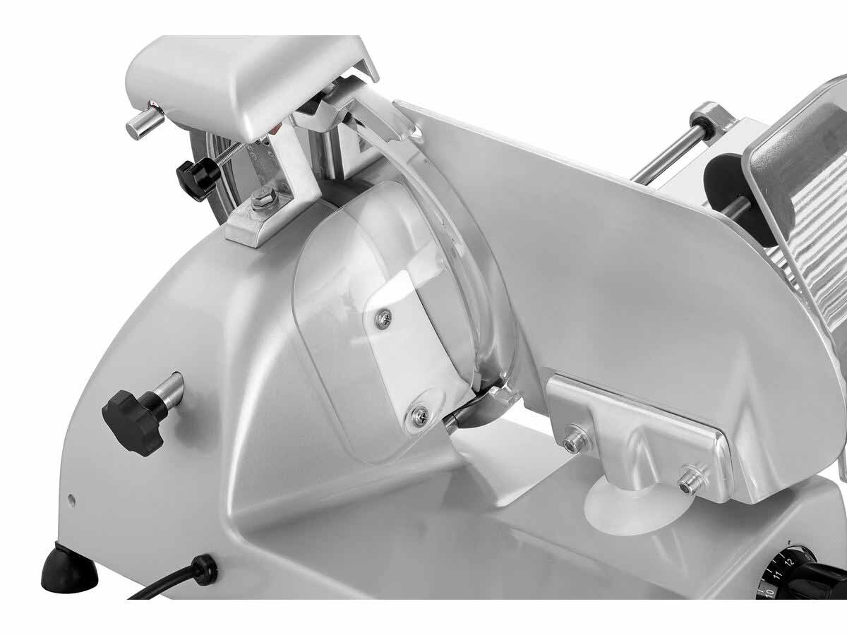 Die Ausstattung der optimierten Aufschnittmaschine mit einem 195er Messer überzeugt durch technische Features in mehrfacher Hinsicht. Der leistungsstarke Schrägschneider verfügt über einen Restehalter, einen Messerschärfer, eine Aufschnittführung und um die Sicherheit zu gewährleisten einen zweifachen Messerschutz sowie einen Magnetschalter.
