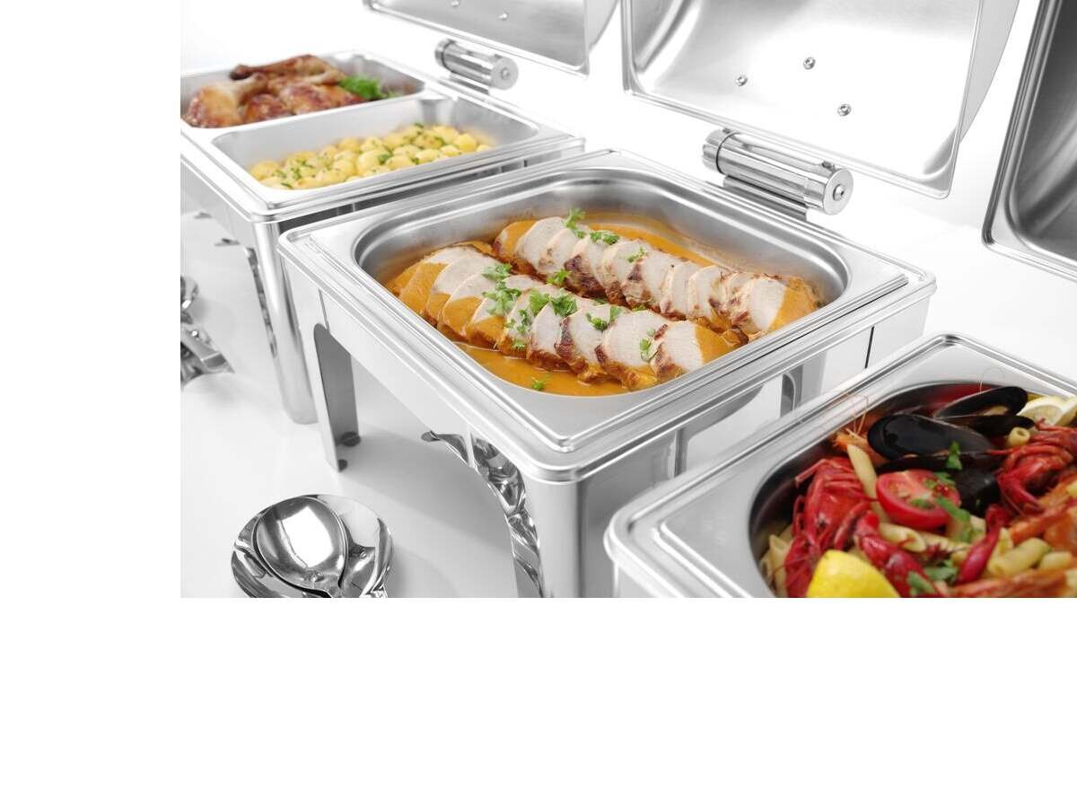 Ideal für Buffets und Catering. Durch die Verwendung von hochwertigen Materialen und dem schönen Finish, eignen sich diese Chafing Dishes zum stilvollen Präsentieren ihrer Speisen. Die Chafing Dishes und das Zubehör sind aus langlebigem Edelstahl gefertigt.