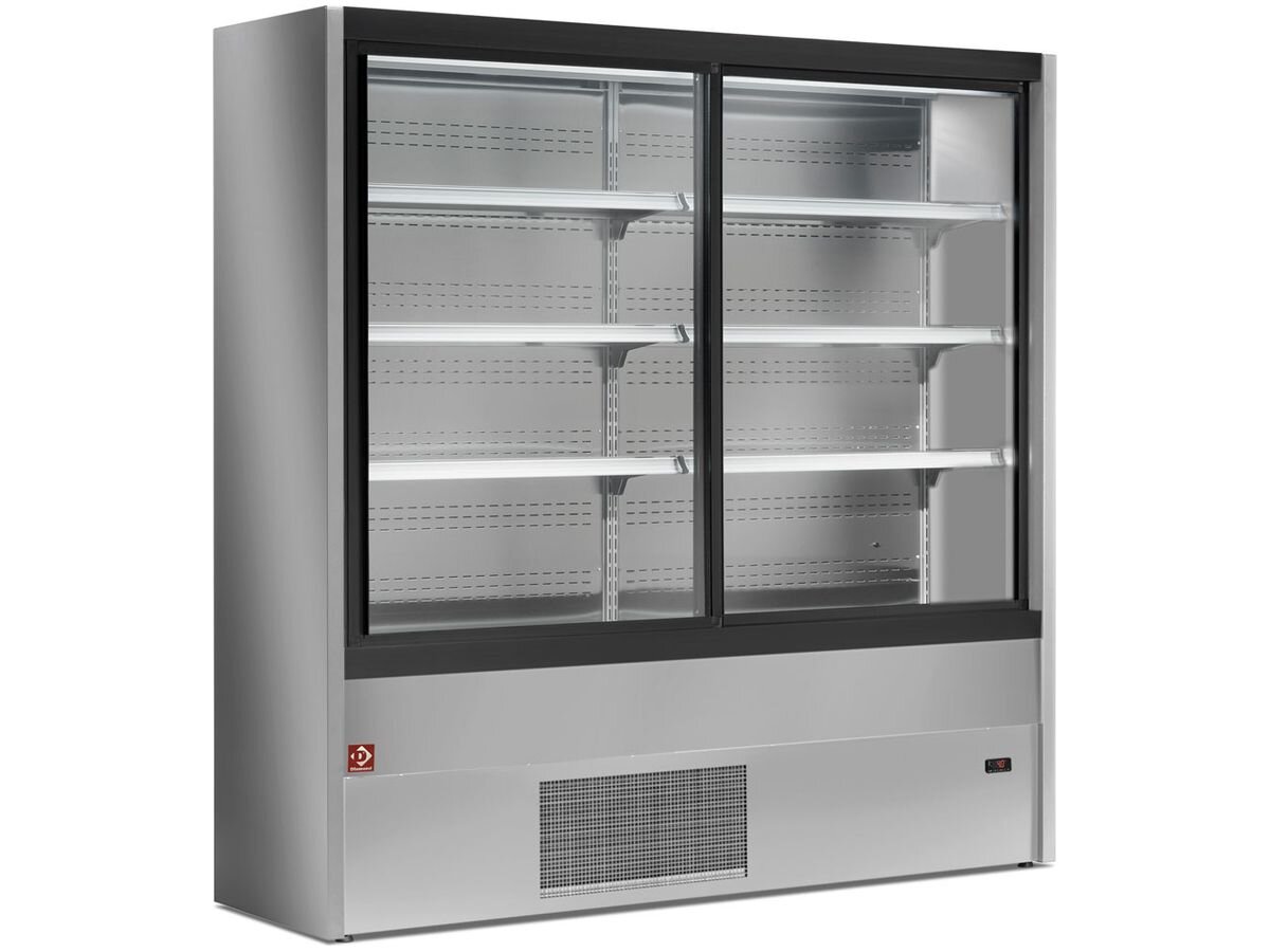 Vielseitig einsetzbar: Das Diamond Padova Line Wandkühlregal, geschlossen in elegantem Grau, ist speziell für den Selbstbedienungsverkauf von Sandwiches, Molkereiprodukten, Käse, Obst, Aufschnitt und Getränken konzipiert. Seine Größe von 1,45 m³ bietet ausreichend Platz für eine Vielzahl von Produkten.