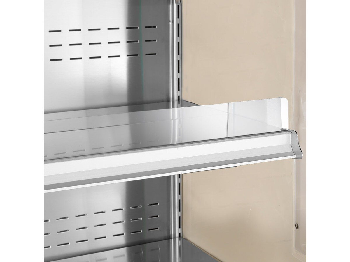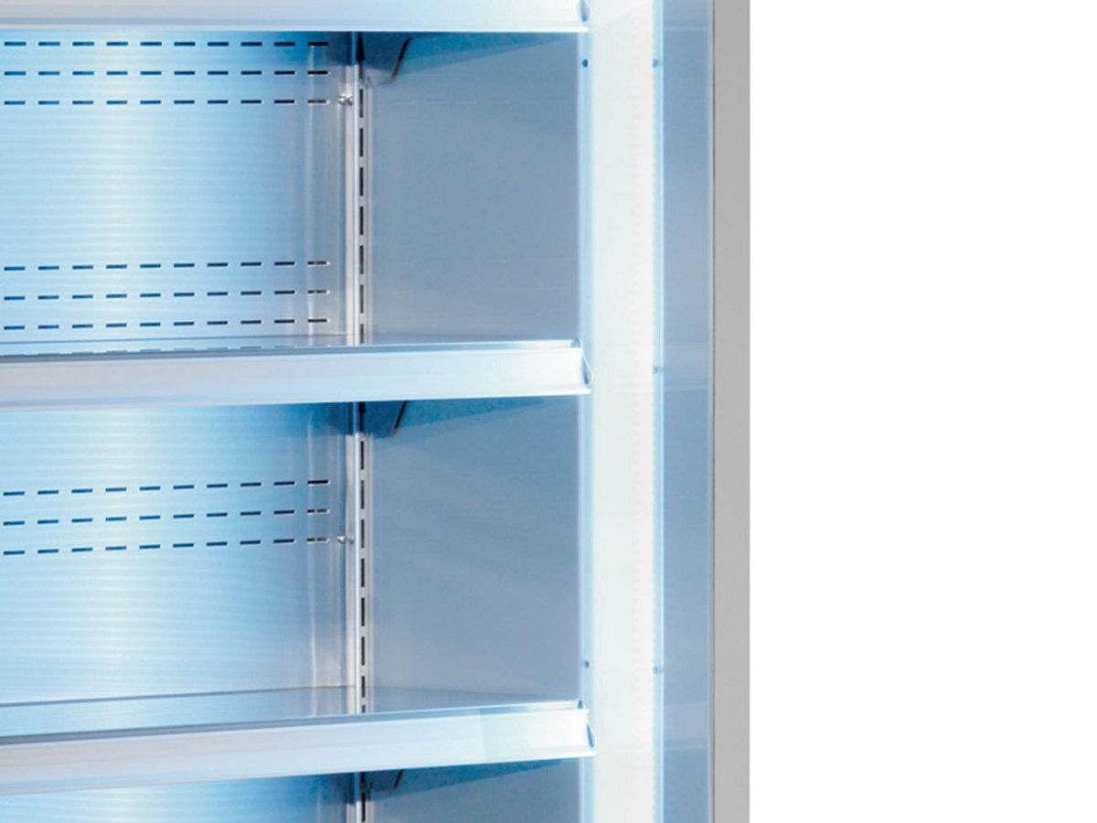 Optimales Design: Ausgestattet mit drei Ausstellböden und praktischen Schiebetüren aus Glas, die nicht nur den Inhalt sichtbar machen, sondern auch die Bildung von Kondenswasser außerhalb des Glases vermeiden. Ein automatisches Türschließsystem erhöht die Benutzerfreundlichkeit.