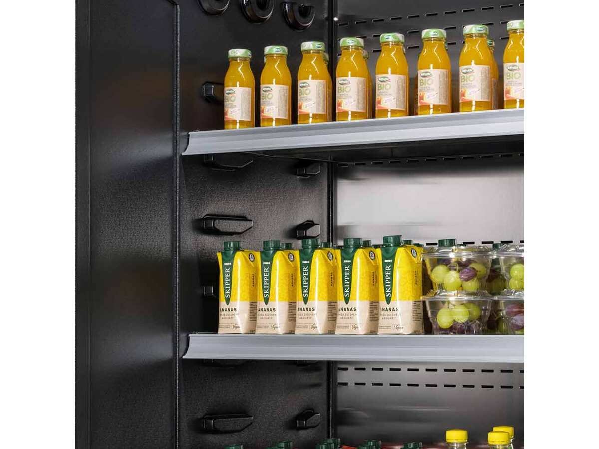 - 3 verstellbare Ausstellungsböden (340 mm), höhenverstellbar mit Preishalterleiste