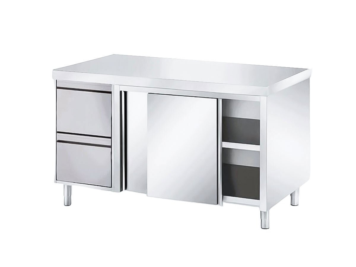 Der Arbeitsschrank aus Edelstahl mit Schiebetüren und 2 Schubladen links bietet professionelle Qualität und Funktionalität. Die lärm- und wasserisolierte Arbeitsplatte sorgt für Stabilität, während der höhenverstellbare Zwischenboden flexible Lagerungsmöglichkeiten bietet.