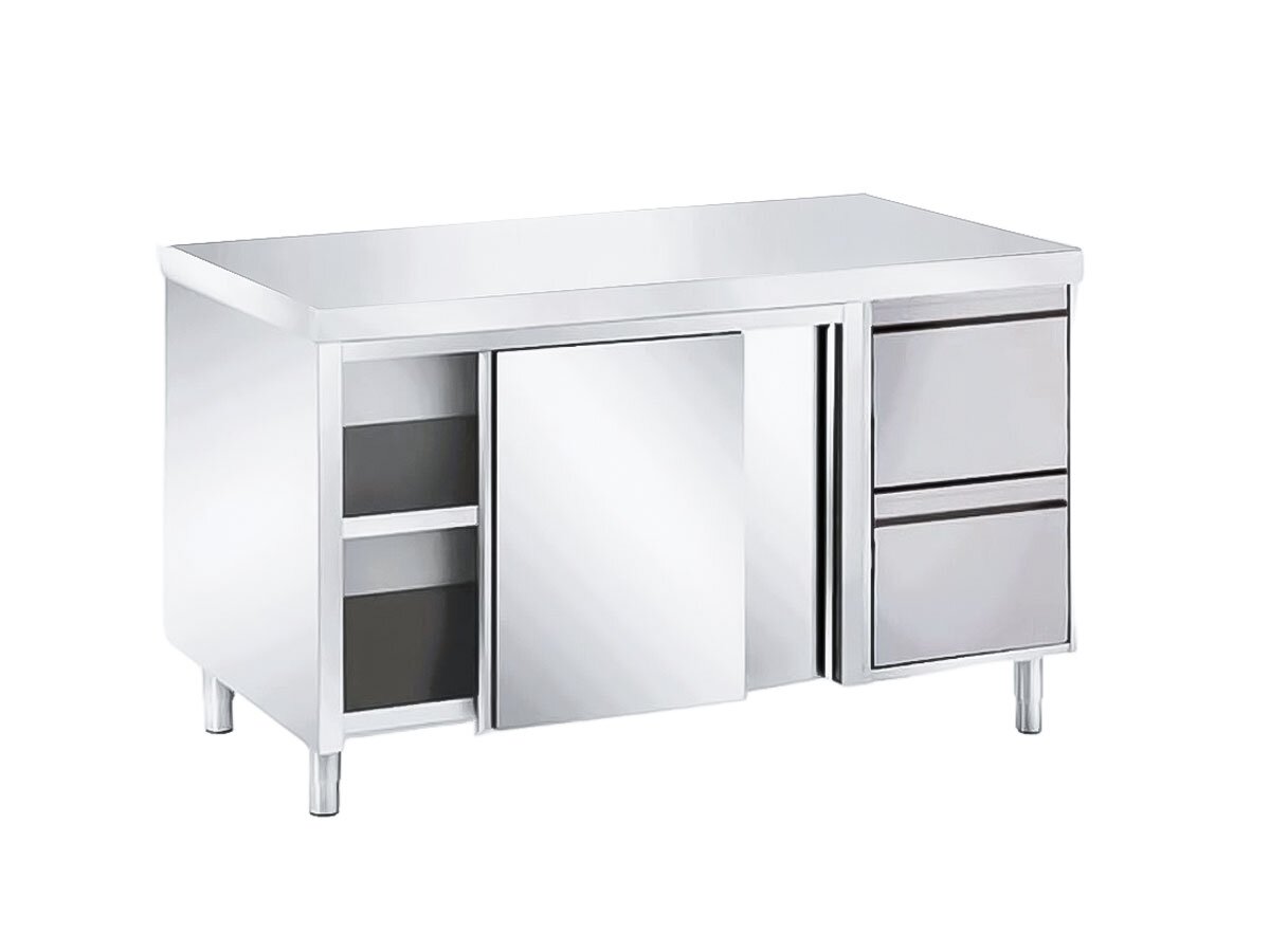 Dieser Edelstahl Arbeitsschrank mit Schiebetüren und 2 Schubladen rechts ist optimal für professionelle Küchen. Die lärm- und wasserisolierte Arbeitsplatte sorgt für eine ruhige Arbeitsumgebung, während der höhenverstellbare Zwischenboden flexible Lagerung ermöglicht.