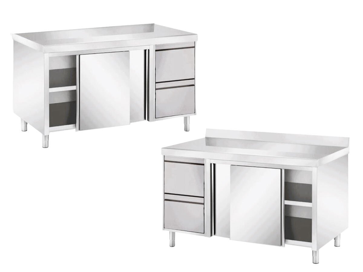 Der Edelstahl Arbeitsschrank PROFI bietet mit seinen 2 Schubladen rechts und der Wahl zwischen Flügeltür oder Schiebetür optimale Flexibilität. Die lärm- und wasserisolierte Arbeitsplatte sorgt für eine ruhige Arbeitsumgebung, während die robuste Bauweise aus Edelstahl Langlebigkeit garantiert.
