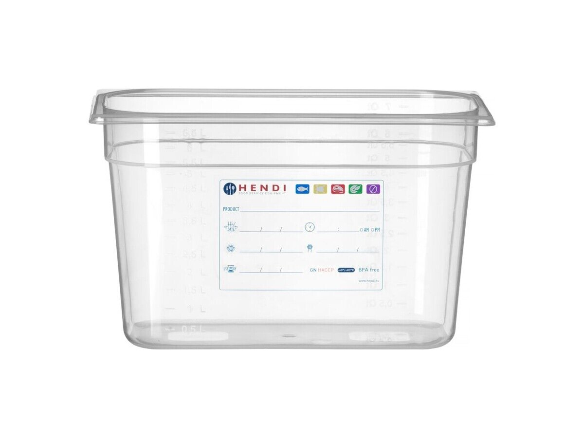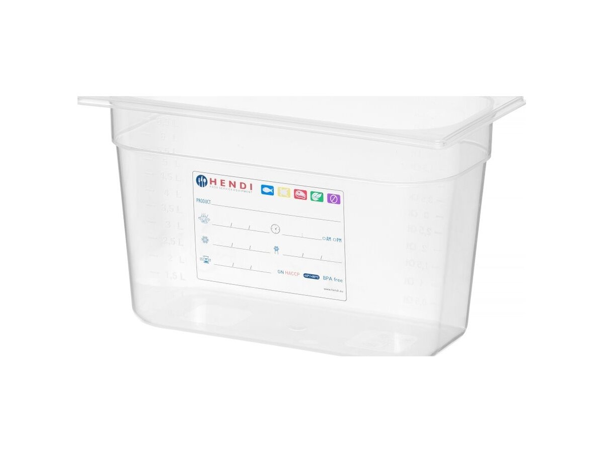 Der HENDI GN-Behälter 1/3 mit 200 mm Tiefe und einem Fassungsvermögen von 7,8 Litern ist ideal für die lebensmittelsichere Lagerung gemäß HACCP-Richtlinien. Hergestellt aus transparentem Polypropylen, ist der Behälter stapelbar, luftdicht und spülmaschinengeeignet. Er nimmt weder Gerüche noch Aromen auf und eignet sich hervorragend zur Organisation und Überwachung der Lebensmittellagerung. Ein verschleißfestes Etikett ist integriert, passende Deckel und Farbcodierungsclips sind separat erhältlich. Temperaturbeständig von -40 °C bis +80 °C.