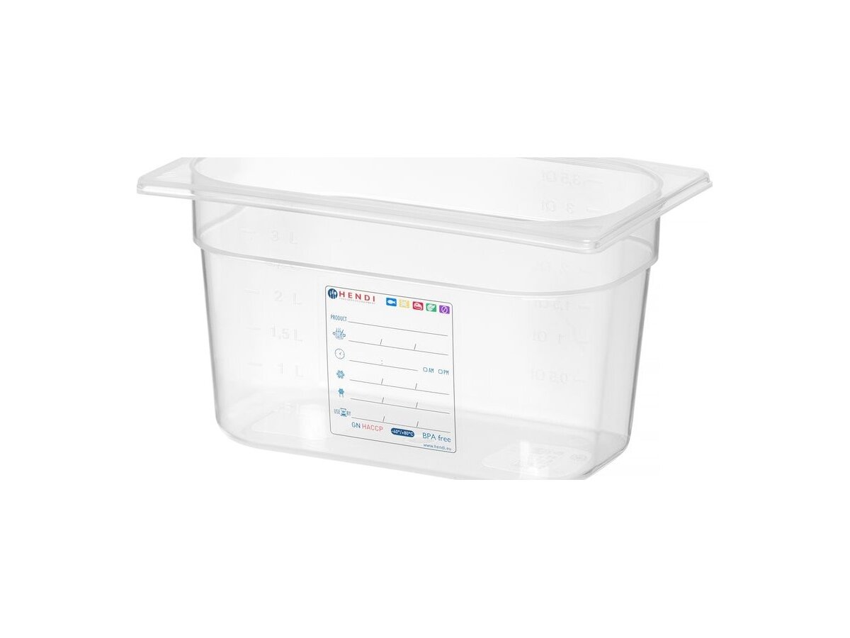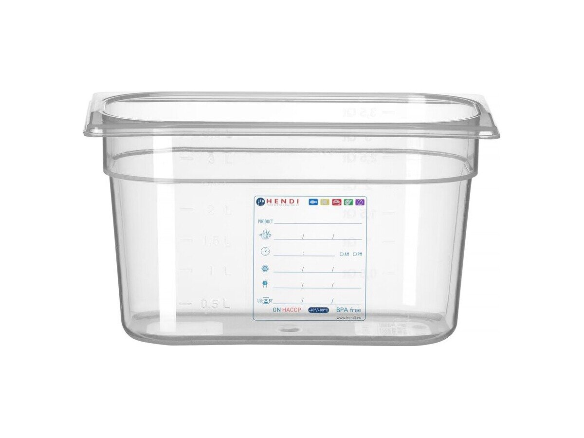 Der HENDI GN-Behälter 1/4 mit 150 mm Tiefe und 4 Litern Fassungsvermögen ist die ideale Lösung für die sichere und hygienische Lagerung von Lebensmitteln. Hergestellt aus transparentem Polypropylen ist der Behälter HACCP-konform, lebensmittelecht, geruchsneutral und luftdicht abschließend. Eine integrierte Etikettierfläche unterstützt die Kontrolle im Lagerprozess. Der Behälter ist stapelbar und temperaturbeständig von -40 °C bis +80 °C. Deckel und Farbcodierungsclips sind separat erhältlich.