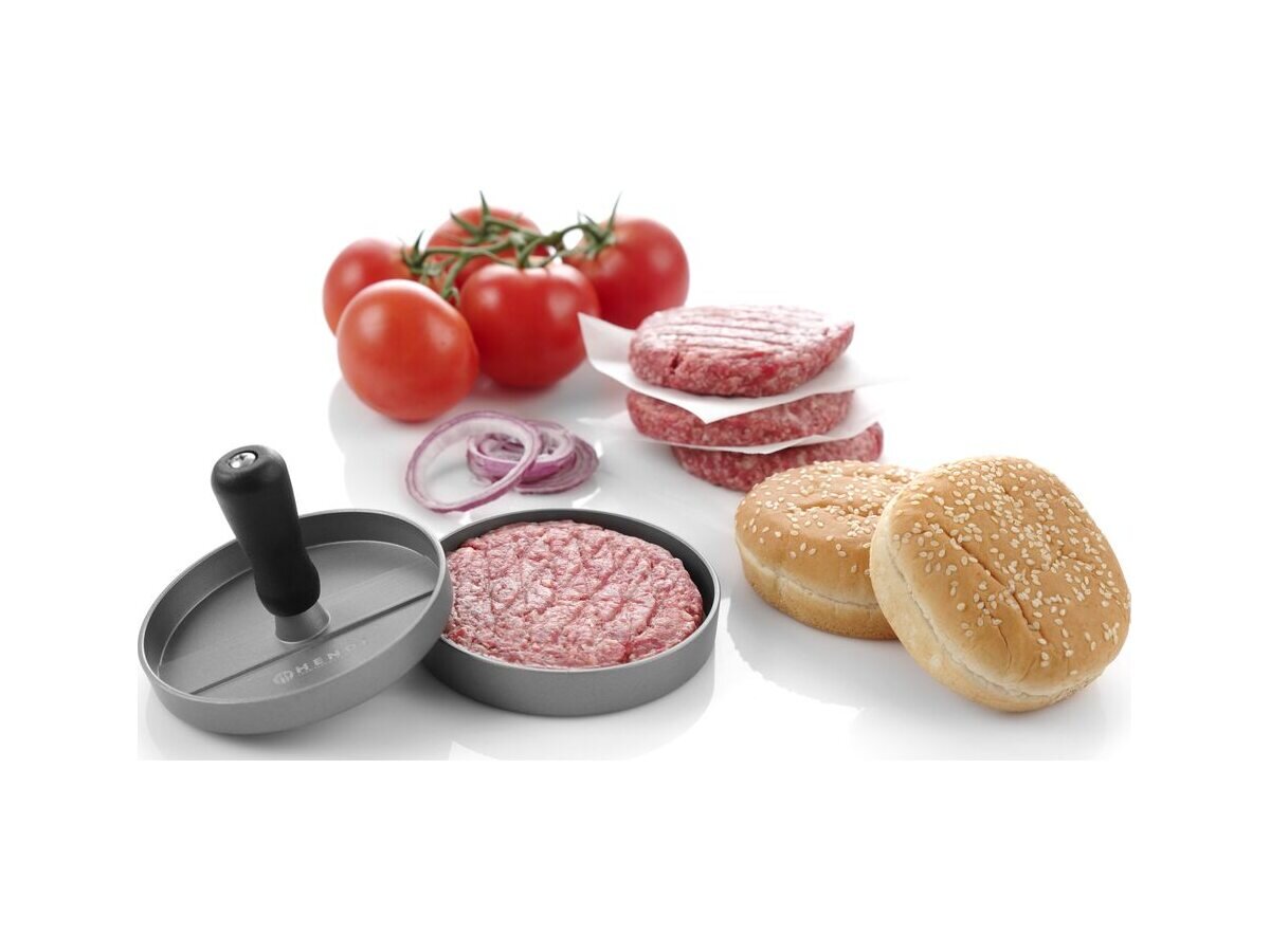Die kompakte Hendi Hamburgerpresse mit 115 mm Durchmesser ist ideal für gleichmäßig geformte Burger-Patties. Das Gehäuse besteht aus robustem Aluminium und ist mit einer Antihaft-Beschichtung versehen, die das Anhaften von Fleisch verhindert und die Reinigung erleichtert. Der ergonomische Griff aus Polypropylen liegt gut in der Hand und sorgt für eine komfortable Handhabung – perfekt für den täglichen Einsatz in Gastronomie, Imbiss oder Grillbereich.