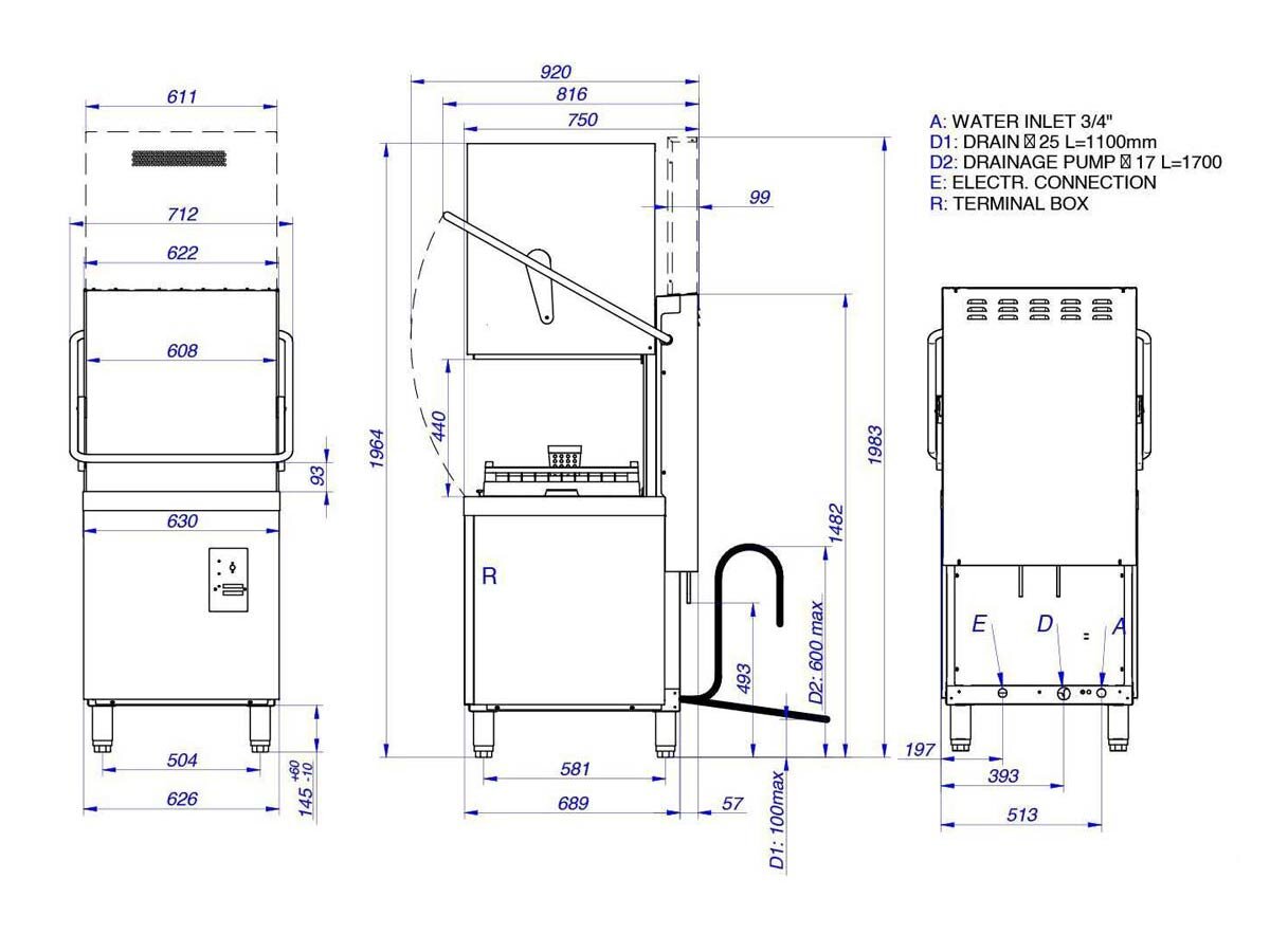 Saro Haubenspülmaschine Berlin, Edelstahl, Spülmittelpumpe, Klarspülerpumpe, BTH 750 x 880 x 1390 mm