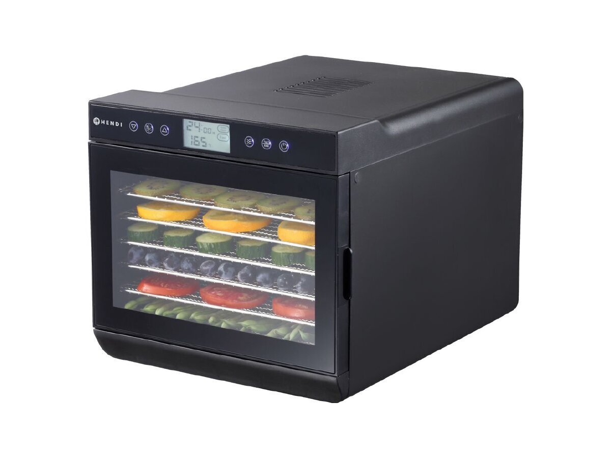 Der HENDI Dörrautomat aus der Kitchen Line ist die perfekte Lösung zum schonenden Trocknen von Obst, Gemüse, Pilzen, Fleisch oder Kräutern. Mit digitalem Bedienfeld, leiser Umlufttechnik und sieben Edelstahlgittern ermöglicht er gleichmäßige und effiziente Dörrergebnisse – ganz ohne Gitterdrehen.