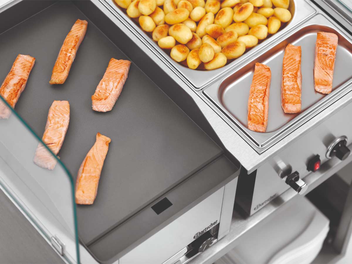 Dieser Einlegeboden ist ausgelegt für Griddleplatte GDP 320E-G und Bain Marie im 1/1 GN-Format. So können die Speisen vorbereitet und bis zur Speisenausgabe warmgehalten werden.