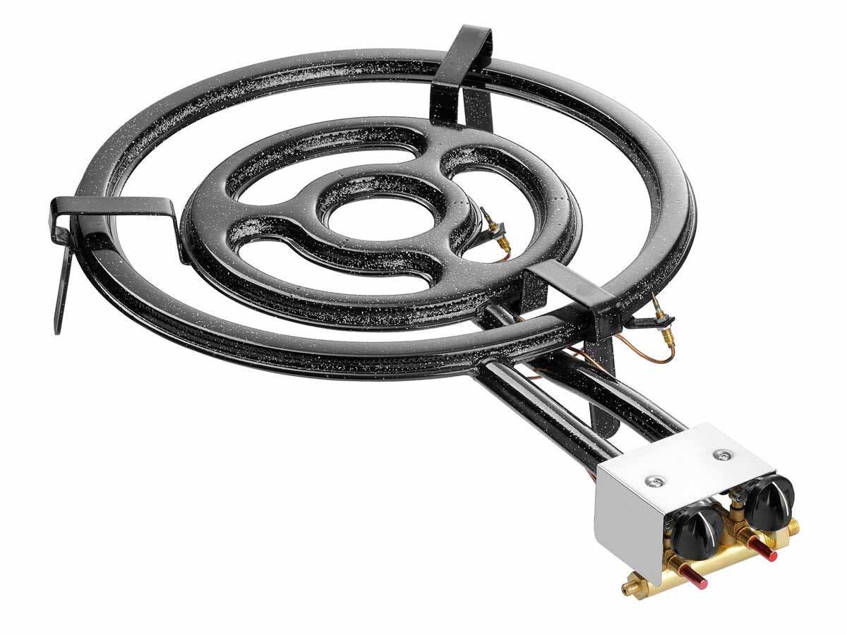 Der Paella Gasbrenner ist eine flexible, ortsungebundene Alternative für die Zubereitung von Pfannengerichten. Der Flammenkreis ist mit einer Zündsicherung und zwei stufenlosen Drehreglern ausgestattet. Mit diesen lässt sich die individuell benötigte Flammengröße regulieren.