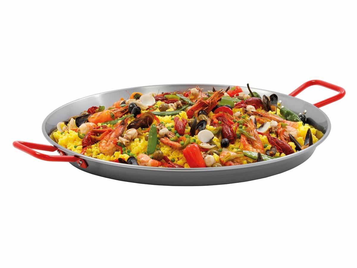 Die robuste Bartscher Paella-Pfanne STP600 ist ideal für vielseitige Gerichte wie Bratkartoffeln, Geschnetzeltes, oder Pfannengyros. Sie zeichnet sich durch eine polierte Stahloberfläche und strukturierte Garfläche mit hohem Rand aus. Die Griffe sind hitzebeständig und rot lackiert, wodurch sie sicher und komfortabel in der Handhabung ist. Der Durchmesser beträgt 600 mm, was großzügigen Platz für die Zubereitung verschiedener Speisen bietet.