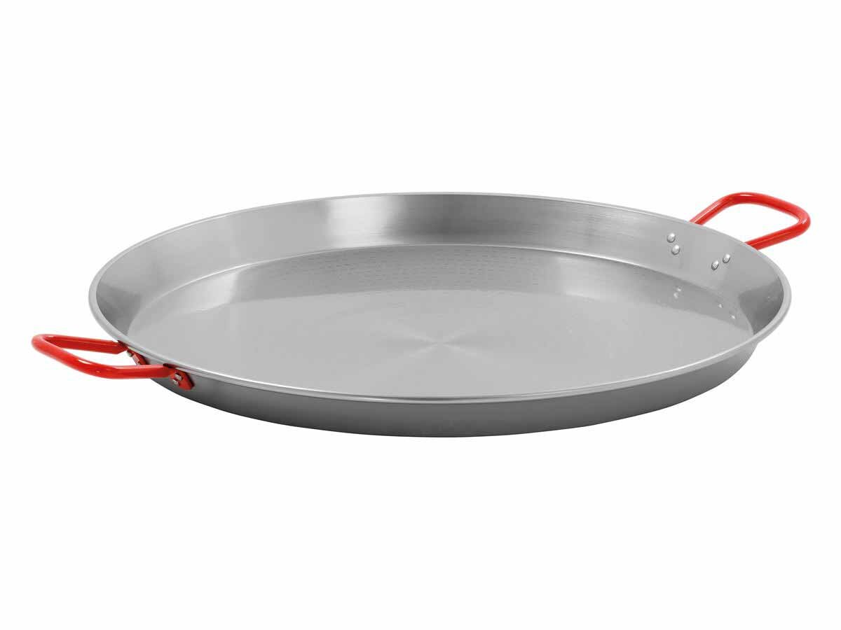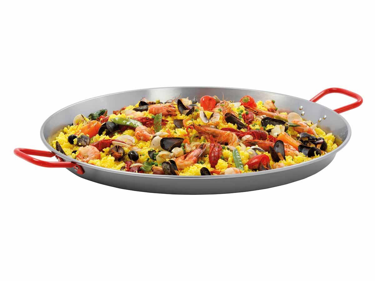 Produktext: Die Bartscher Paella-Pfanne STP650 eignet sich ausgezeichnet für die Zubereitung von Paella und anderen Gerichten wie Bratkartoffeln oder Pfannengyros. Die Pfanne besteht aus robustem, poliertem Stahl und besitzt eine strukturierte Garfläche mit hohem Rand. Die hitzebeständigen, rot lackierten Griffe sind fest montiert und unterstützen eine sichere Handhabung. Mit einem Durchmesser von 650 mm bietet die Pfanne viel Platz für große Portionen, ideal für Gastronomie und Event-Catering.