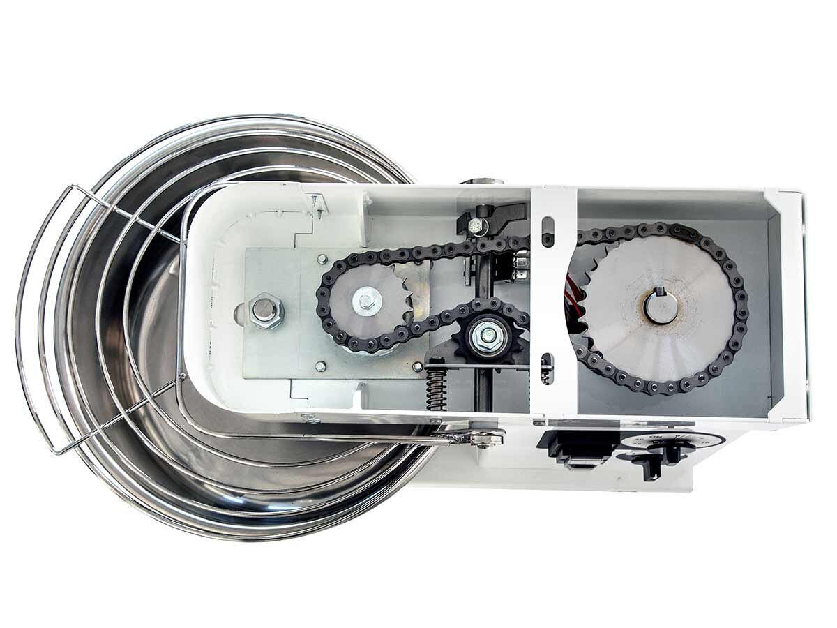 Alle Teigmaschinen sind mit einem Teigbrecher und stufenloser Geschwindigkeitsregelung ausgestattet. Kessel, Wanne, Spirale, zentraler Knethaken und Schutzgitter sind aus Edelstahl. Das Getriebesystem ist mit einem Ölbad-Getriebemotor ausgestattet. Alle Maschinen sind mit einem Teigkneter ausgestattet.