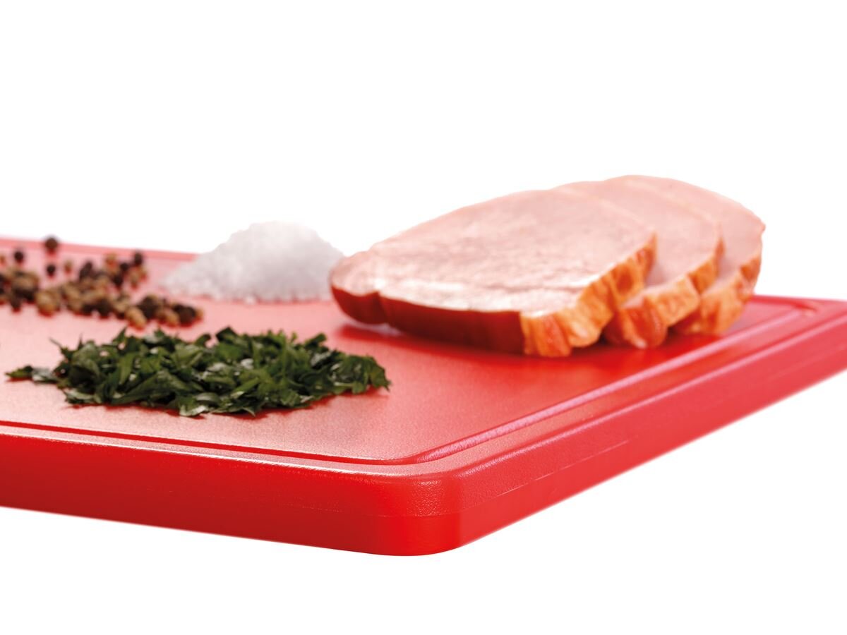 Das rote Bartscher Schneidbrett PRO ist speziell für rotes Fleisch wie Rind, Schwein oder Wild vorgesehen und erfüllt höchste Hygieneanforderungen nach HACCP. Die großzügige Schnittfläche mit praktischer Saftrinne sorgt für sauberes Arbeiten, während die 6 rutschfesten Gummifüße für maximale Sicherheit sorgen. Gefertigt aus geschmacksneutralem und robustem Polyethylen, ist das Schneidbrett schnittfest, spülmaschinengeeignet und messerschonend – ideal für den täglichen Einsatz in der Profi-Küche.