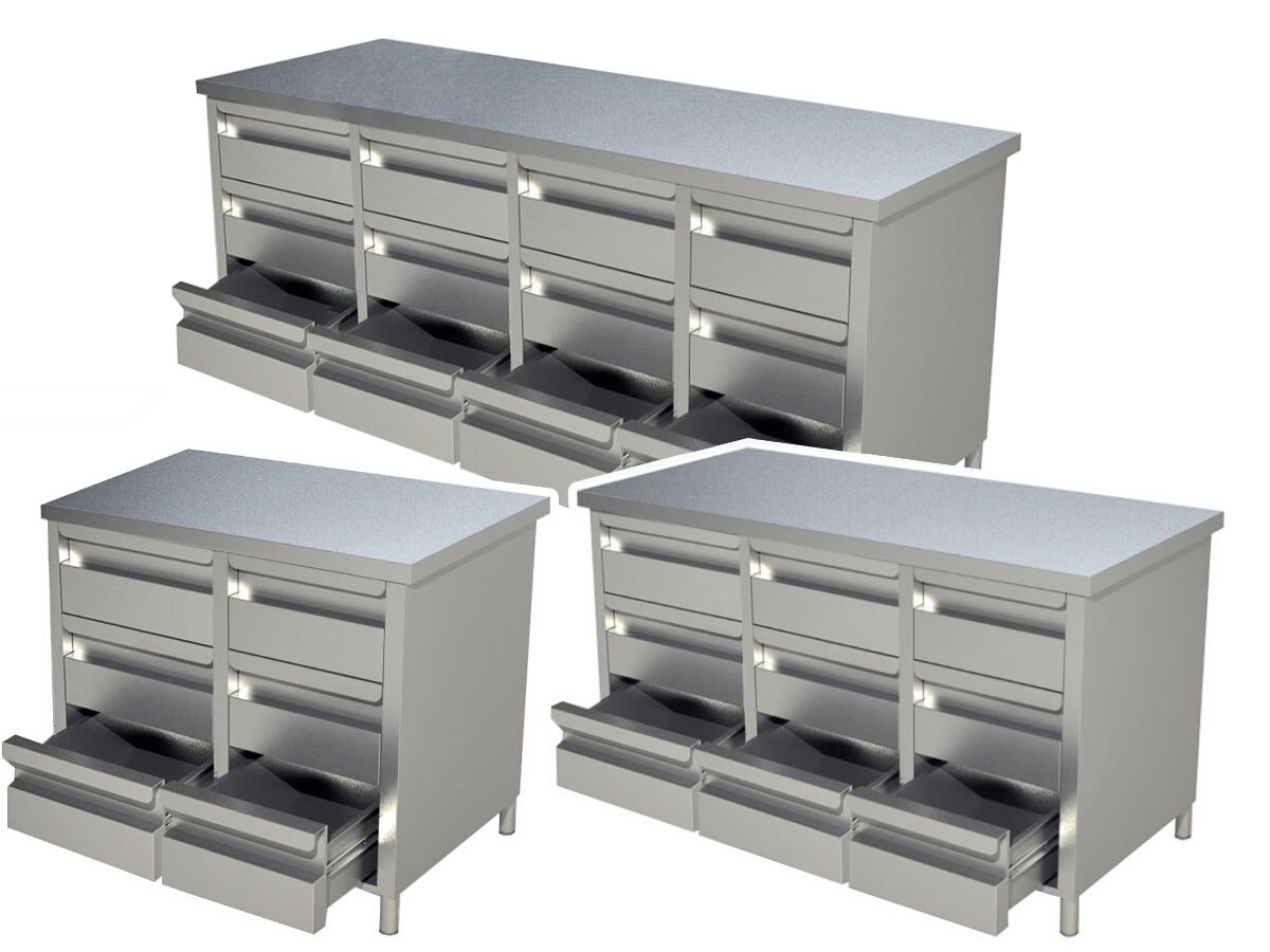 Der PREMIUM Edelstahl Schubladenschrank bietet eine robuste Arbeitsfläche mit verstärktem Holz und lärm- sowie wasserisolierter Oberfläche. Die verstellbaren Standfüße) und die flexible Schubladenanordnung machen ihn ideal für professionelle Küchen.
