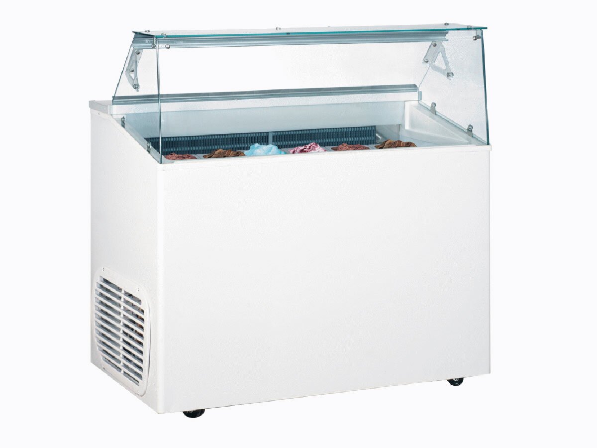 Speiseeis-Verkaufsvitrine für 7 Eisschalen 5 Liter Typ C im Bedienbereich oder 14 Eisschalen 2,5 Liter. Reservefach mit selbstschließender Tür zur Unterbringung von 12 Eisschalen 5 Liter Typ C. Lieferung erfolgt inkl. geradem Glasaufbau aus Sicherheitsglas zur Selbstmontage. Die separat schaltbare LED-Innenbeleuchtung sorgt für eine gleichmäßige Ausleuchtung der Ausstellungsfläche und eine perfekte Warenpräsentation.