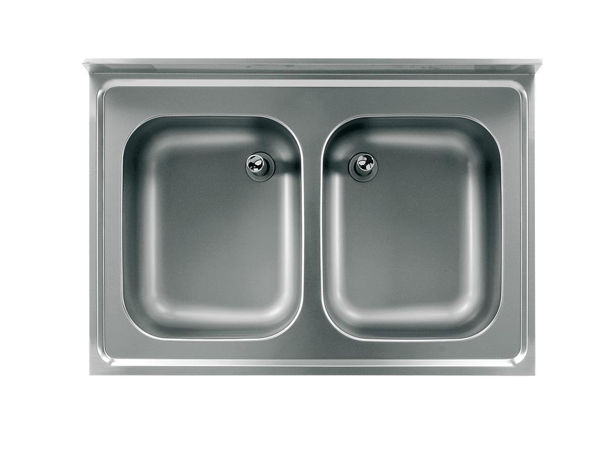 Diese Spülabdeckung aus Edelstahl bietet mit ihren zwei mittig platzierten Becken ausreichend Platz für professionelle Küchen. Die robuste Konstruktion und die Aufkantung verhindern Wasserschäden und sorgen für eine längere Lebensdauer.