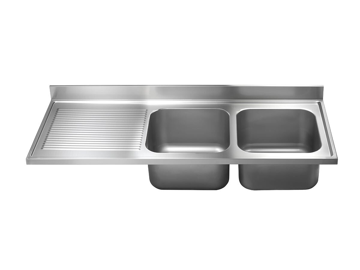 Diese hochwertige Spülabdeckung aus Edelstahl ist ideal für professionelle Küchen. Sie bietet mit zwei rechtsseitigen Becken und einer 100 mm Aufkantung optimalen Spritzschutz und Funktionalität.