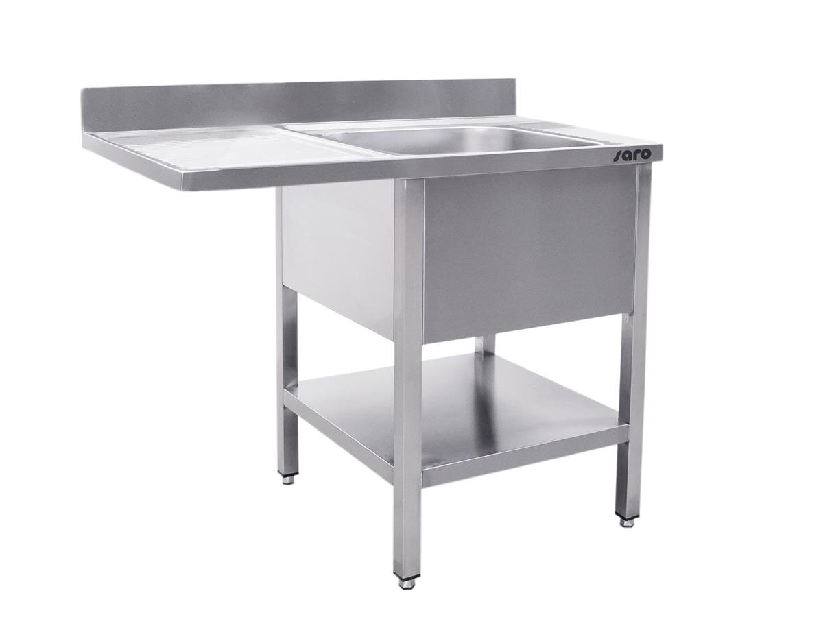 Das Saro Spülcenter mit einem rechtsseitigen Becken bietet eine effiziente Lösung für professionelle Küchen. Hergestellt aus hochwertigem Edelstahl, garantiert es Langlebigkeit und einfache Reinigung. Die integrierte Ablage mit Ablaufrinnen sorgt für zusätzlichen Komfort.