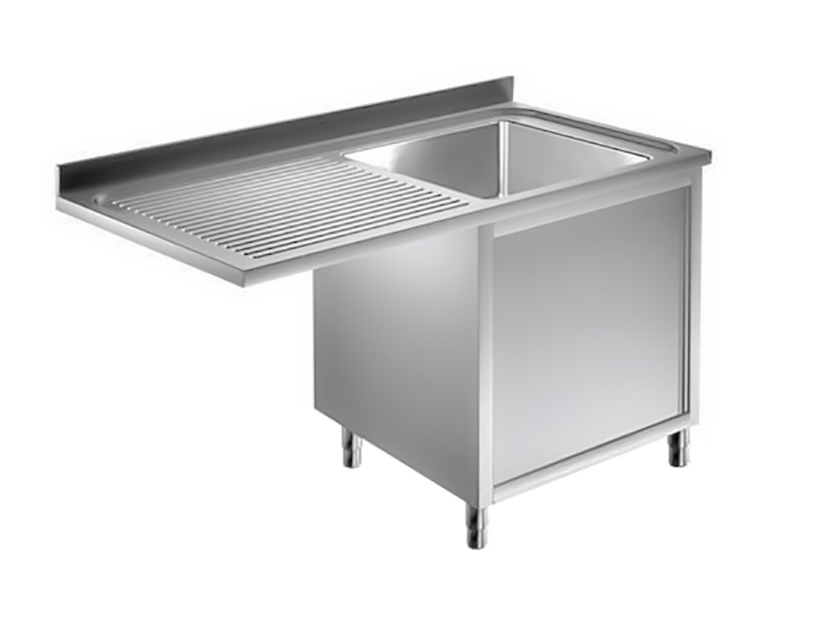 Das PREMIUM Edelstahl Spülschrankzentrum bietet mit einem rechtsseitigen Becken und praktischen Schiebetüren eine optimale Lösung für professionelle Küchen. Die integrierte Abtropffläche und die Aufkantung sorgen für zusätzlichen Komfort und Hygiene.