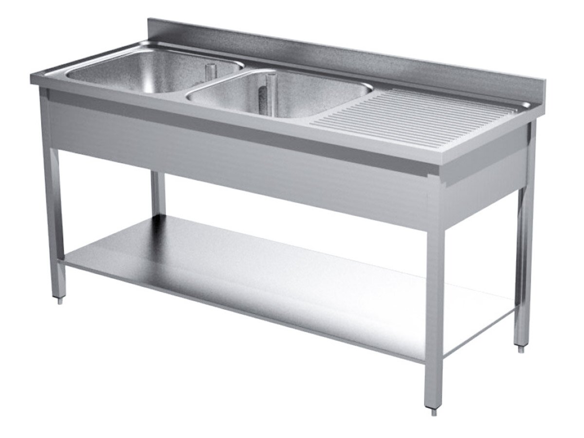 Der PREMIUM Edelstahl Spültisch bietet mit seinen zwei linksseitigen Becken und der praktischen Abtropffläche optimale Funktionalität für professionelle Küchen. Die robuste Konstruktion aus Edelstahl AISI304 und der verschweißte Grundboden sorgen für Langlebigkeit und Stabilität.