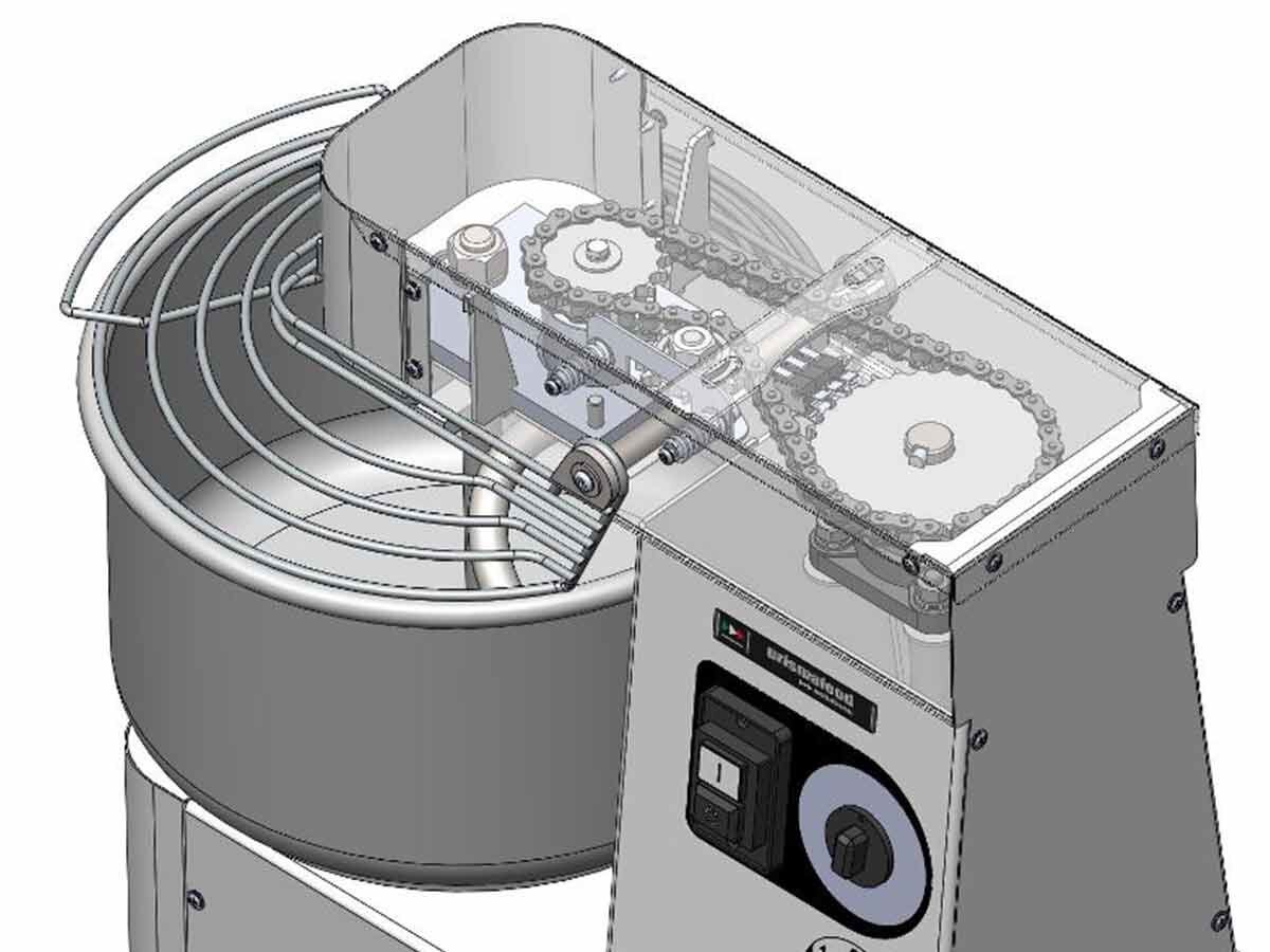 Alle Teigmaschinen sind mit einem Teigbrecher und stufenloser Geschwindigkeitsregelung ausgestattet. Kessel, Wanne, Spirale, zentraler Knethaken und Schutzgitter sind aus Edelstahl. Das Getriebesystem ist mit einem Ölbad-Getriebemotor ausgestattet. Alle Maschinen sind mit einem Teigkneter ausgestattet.