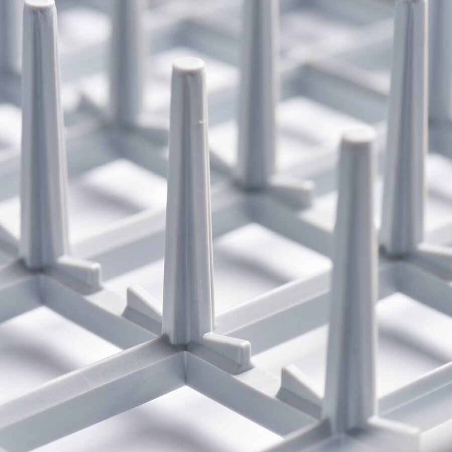 Die durchdachte Bauweise lässt Wasser und Luft optimal zirkulieren für eine sorgfältige Reinigung und die perfekte Trocknung Ihres Spülguts! Die Teller und Tabletts werden dabei sicher durch die Anordnung der konischen Finger gehalten, um Bestoßungen zu verhindern.