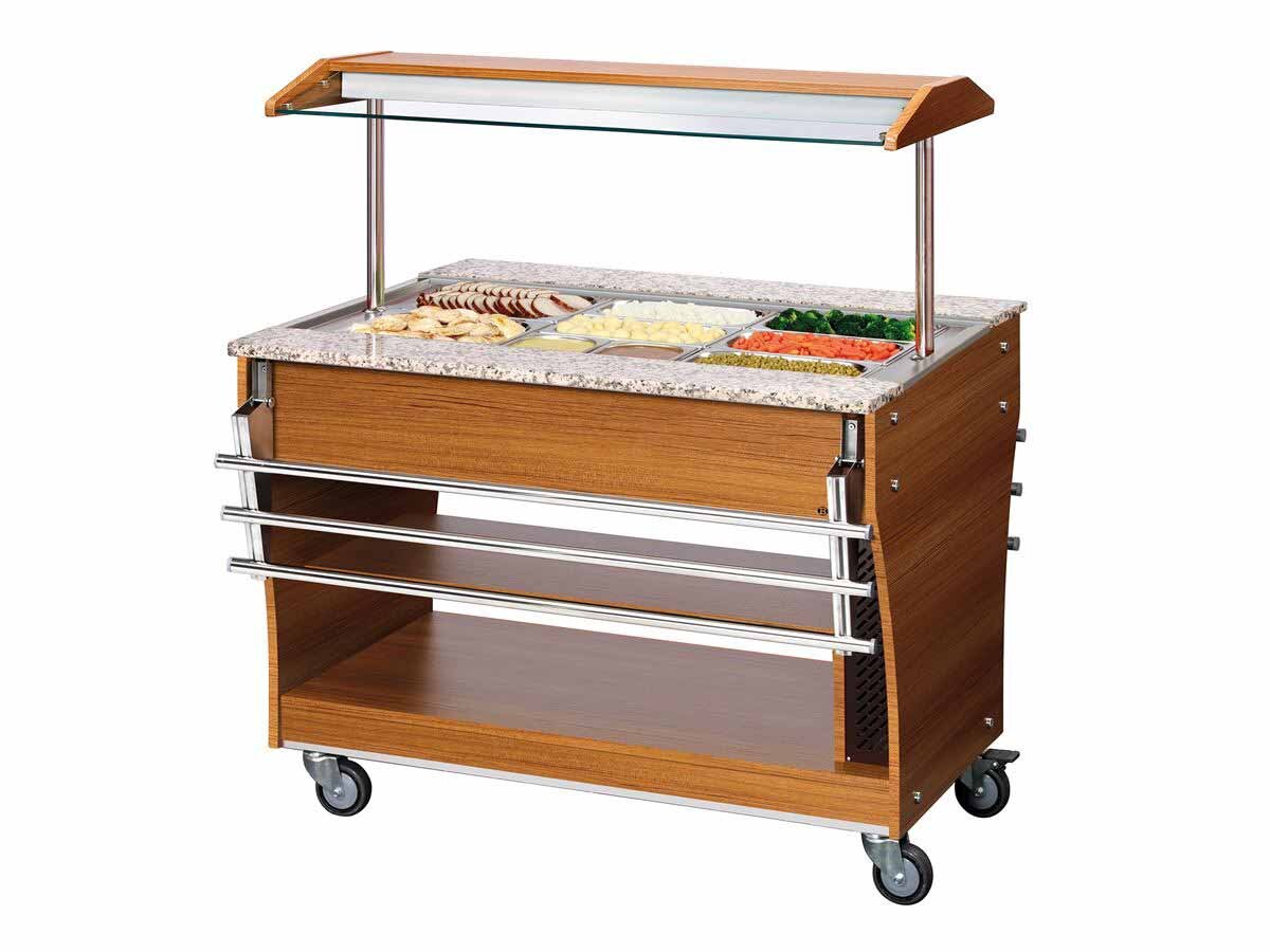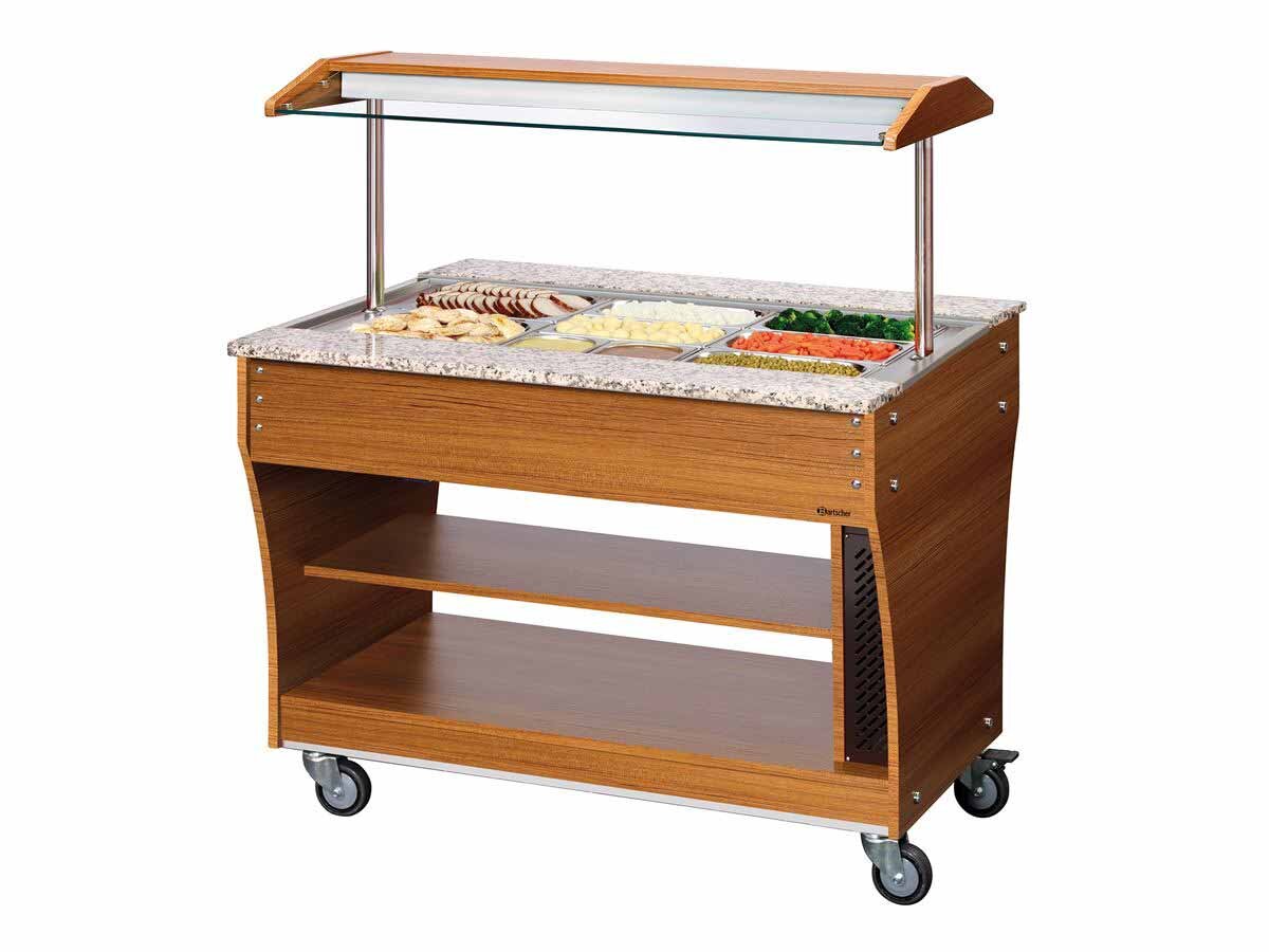 "Warme Speisen" perfekt präsentiert.. Der Buffetwagen ist mit der integrierten Beleuchtung, dem Hustenschutz mit Ablagefunktion und Rollen für bequeme Transportmöglichkeiten optimal ausgestattet.