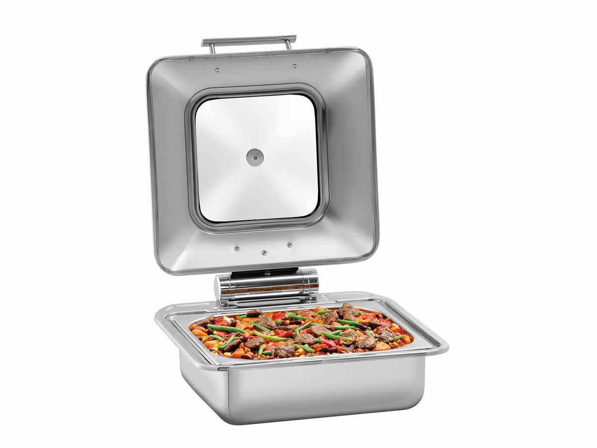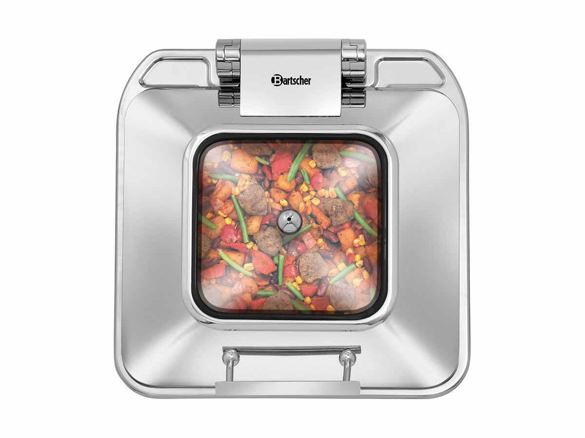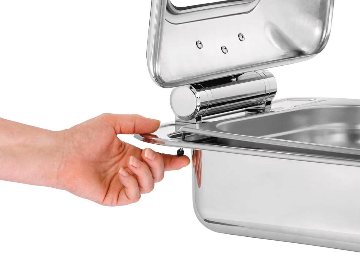 Ob Induktion oder Glaskeramik – Chafing Dish im 2/3 GN-Format für eine flexible Nutzung auf einem Einbaukochfeld. Der abnehmbare Deckel erleichtert den Austausch des GN-Behälters an Buffets, in Kantinen oder im Frontcooking-Bereich.