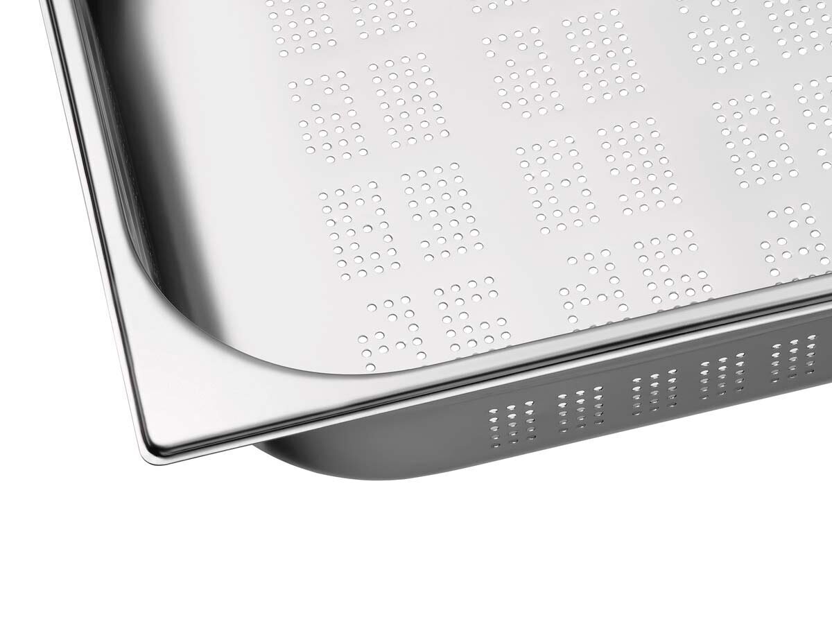 Der gelochte GN-Behälter 2/3 aus der Bartscher Top Line Serie ist die ideale Wahl für den Einsatz in Kombidämpfern oder anderen Geräten mit Dampfgarfunktion. Hergestellt aus hochwertigem CNS 18/10 mit glänzender Oberfläche, ist der Behälter langlebig, rostfrei und besonders pflegeleicht. Die Lochung ermöglicht ein gleichmäßiges Garen und Abtropfen von Flüssigkeiten – ideal für schonendes Dämpfen.