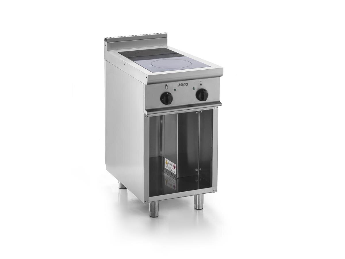 Der Saro Induktionsherd mit offenem Unterbau bietet professionelle Leistung und Flexibilität in der Gastronomie. Ausgestattet mit zwei leistungsstarken Kochzonen und einem digitalen Anzeigesystem, ermöglicht er präzise Temperaturregelung und effizientes Kochen. Die Cool-Grip Griffe und Knöpfe sorgen für Sicherheit und Komfort.