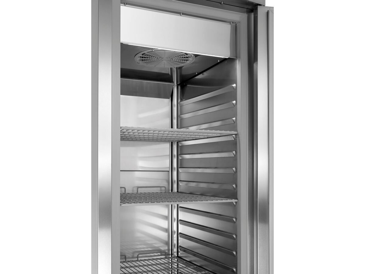 Geräumig und clever - Der stilvolle Edelstahl-Tiefkühlschrank bietet mit 700 Litern Fassungsvermögen im 2/1 GN-Format maximale Flexibilität. Ein Signalton warnt vor einer Unterbrechung der Kühlkette bei zu lange geöffneter Tür.- Höhenverstellbar: 2040 mm bis 2090 mm