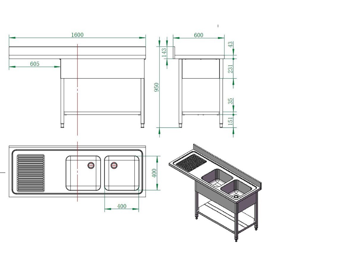 Robustes vaiotec EASYLINE 600 Spülzentrum mit 2 Becken rechts und Grundboden in Breite 1600 mm