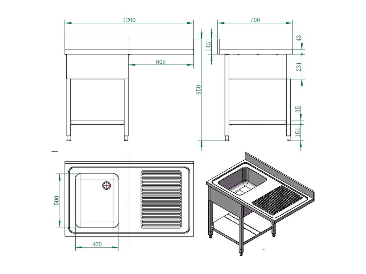 Robustes vaiotec EASYLINE 700 Spülzentrum mit Becken links und Grundboden in Breite 1200 mm