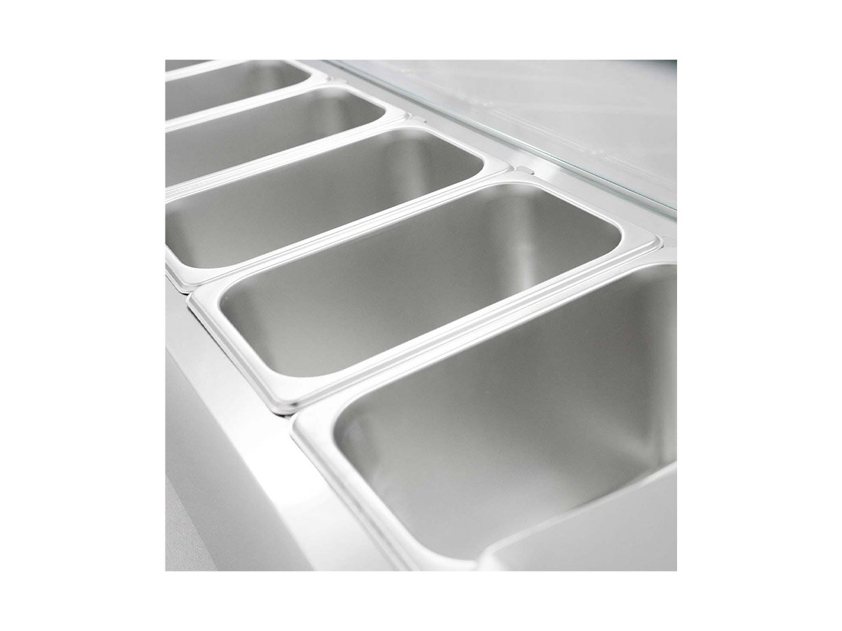 Der Temperaturbereich von +2 bis +10°C sorgt für optimale Frische, gesteuert über ein digitales Carel-Thermostat. Das Gerät verfügt über eine automatische Abtaufunktion und ist dank des robusten Edelstahlkorpus und abgerundeter Innenkanten pflegeleicht und hygienisch.