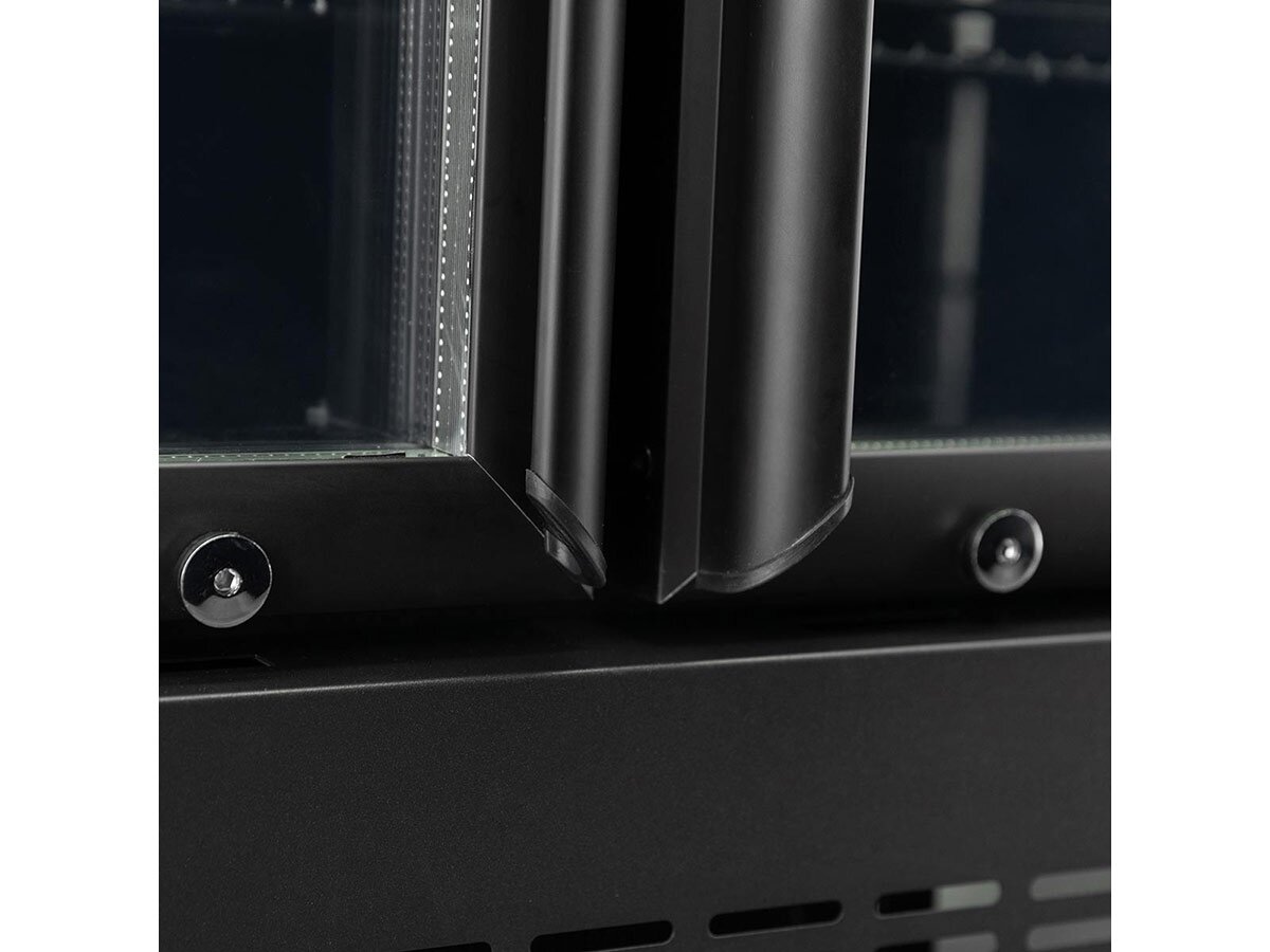 Der schwarze Getränkekühlschrank vaiotec TOPLINE 1500 mit 3 selbstschließenden Flügeltüren und einem Bruttovolumen von 1470 Litern bietet großzügigen Platz für Ihre Getränkepalette. Dank Umluftkühlung, digitalem Thermostat und Gebläseverdampfersystem gewährleistet er eine zuverlässige Kühlung zwischen +0 und +7°C. Das auffällige LED-Display oben und die LED-Innenbeleuchtung präsentieren Ihre Produkte ansprechend.