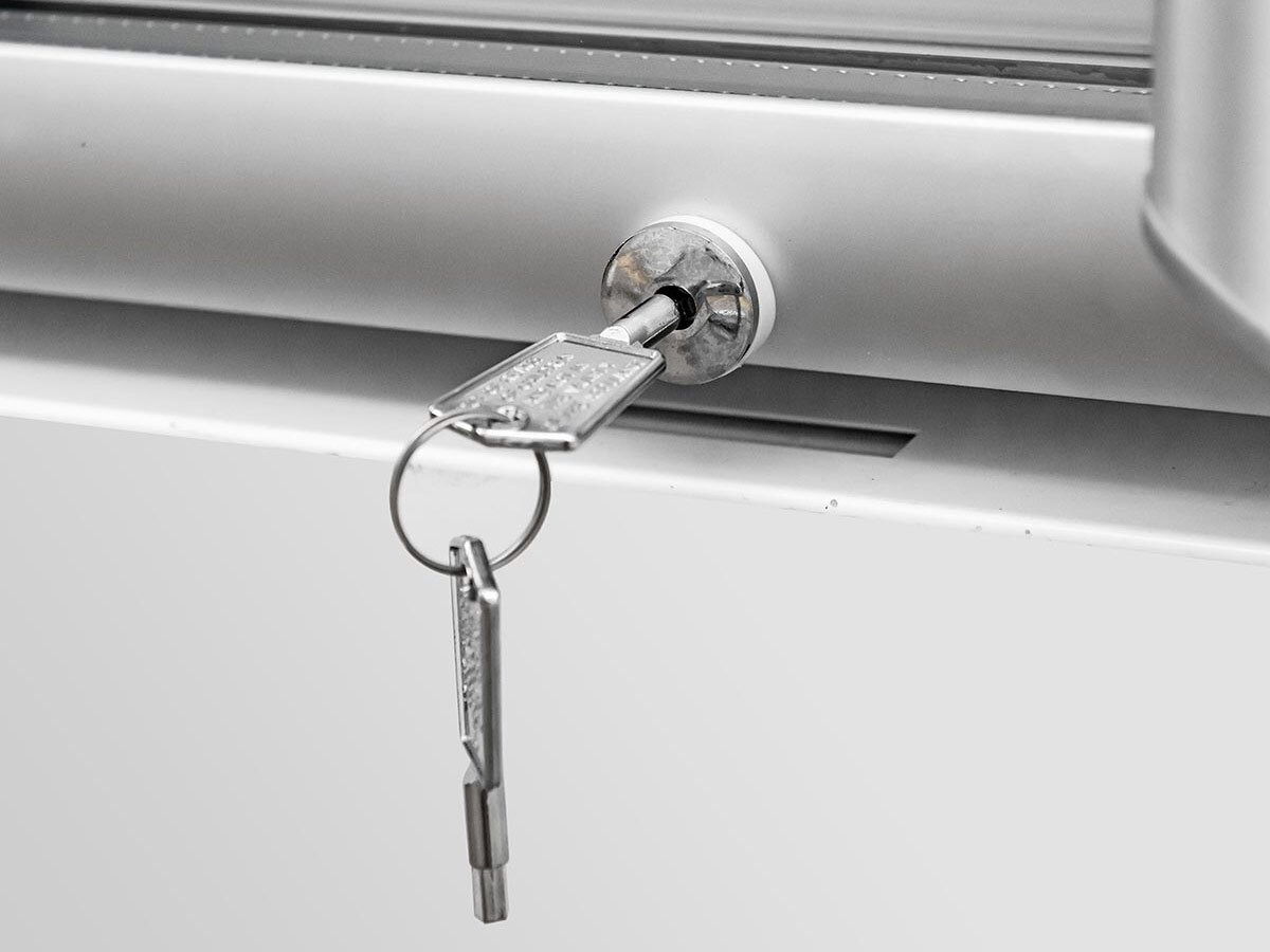 - 3 doppelverglaste, selbstschließende Flügeltüren, abschließbar