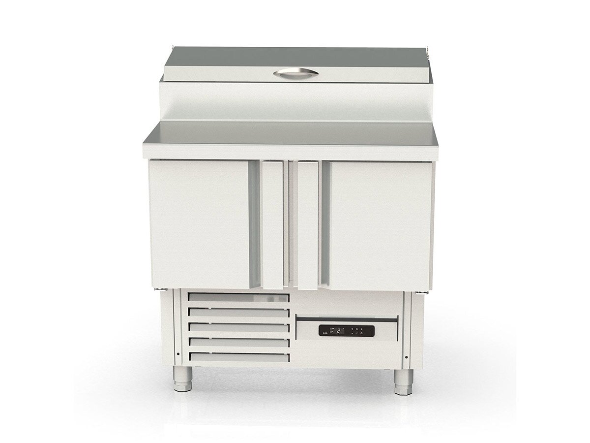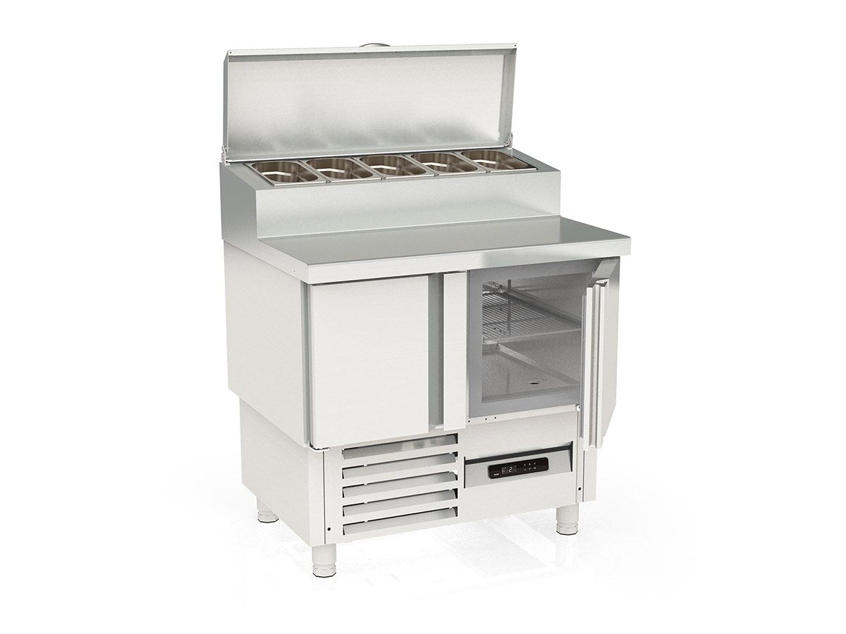 Die vaiotec TOPLINE 700 Belegstation mit Türen und einem eckigen Glasaufsatz bietet Platz für GN1/4 Behälter. Die energiesparende Umluftkühlung und das digitale Dixell-Thermostat mit Alarmfunktion garantieren optimale Kühlleistung. Dank der Granitarbeitsplatte und des robusten Edelstahlgehäuses ist die Station besonders langlebig und pflegeleicht.