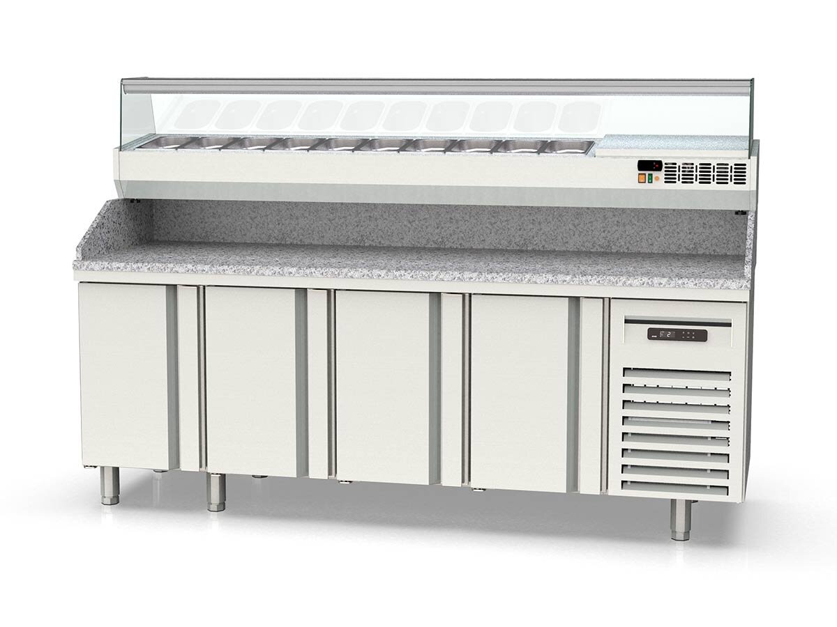 vaiotec TOPLINE 700 Pizzatisch 500, 4 Türen, graue Granitplatte, inkl. Kühlaufsatz - Optimale Pizzazubereitung mit Kühlaufsatz