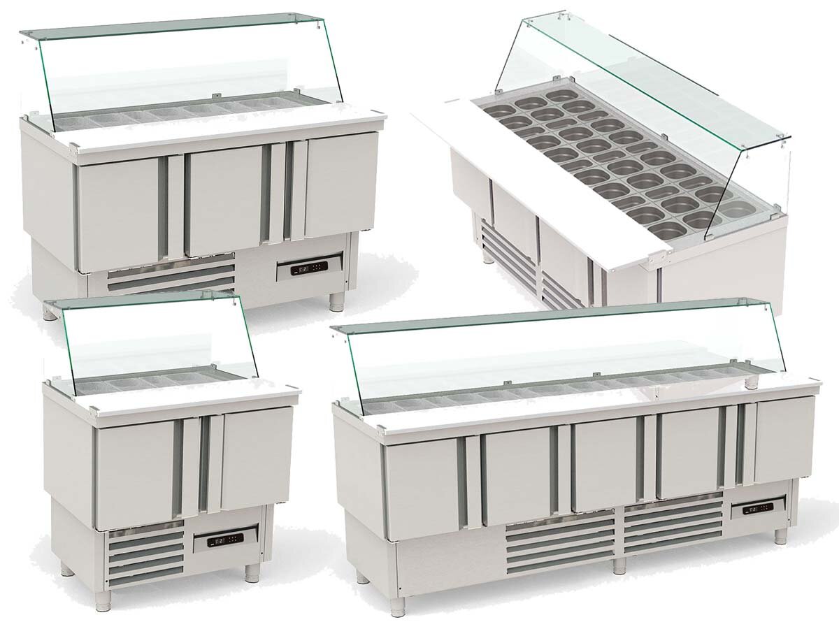 vaiotec TOPLINE 700 Saladette, mit Türen, Glasaufsatz schräg, für GN 1/6 in verschiedenen Breiten