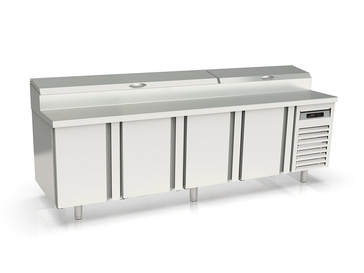 Die vaiotec TOPLINE 800 Belegstation mit Türen und einem eckigen Glasaufsatz bietet Platz für GN1/3 Behälter. Die energiesparende Umluftkühlung und das digitale Dixell-Thermostat mit Alarmfunktion garantieren optimale Kühlleistung. Dank der Granitarbeitsplatte und des robusten Edelstahlgehäuses ist die Station besonders langlebig und pflegeleicht.
